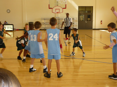I've been meaning to post some pics of Logan playing basketball. He's been playing all summer in the Y's summer league. This Saturday is their last game of the season. Basketball is his favorite sport and the one he's best at. It's probably a good thing since he's tall and thin. This is a great example of the weird faces Logan makes while he's playing. I don't know why he can't seem to dribble or shoot without opening up his mouth and contorting his face. Maybe that's how Jim Carrey started out? Wishful thinking...